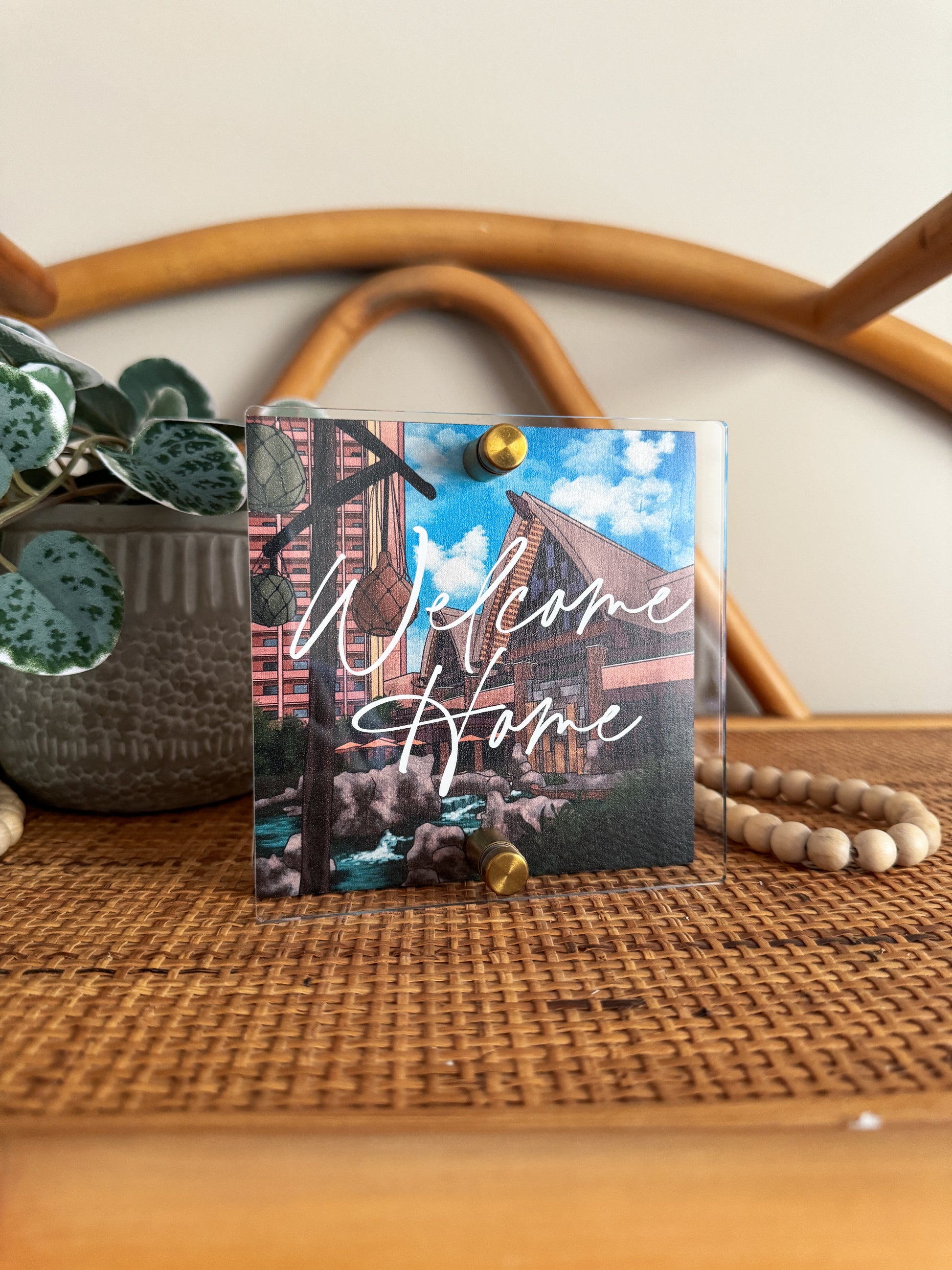 Custom Designed Block Sign featuring home resort printed on a natural block, "Welcome Home" Plaque & gold hardware. Measures 5x5" Grain/Stain pattern may vary.