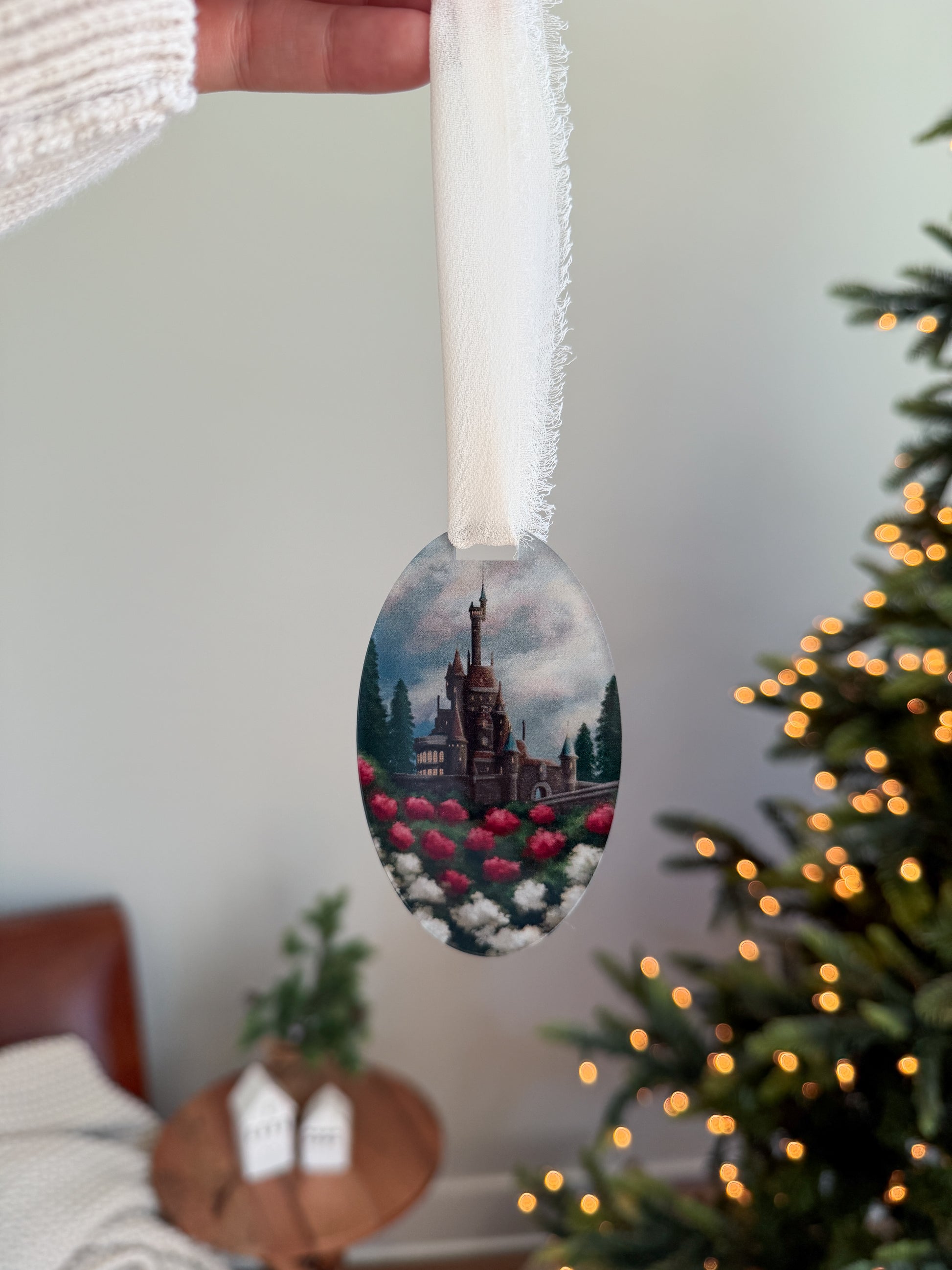 3" Luxe Printed Acrylic Ornament with Chiffon Ribbon.