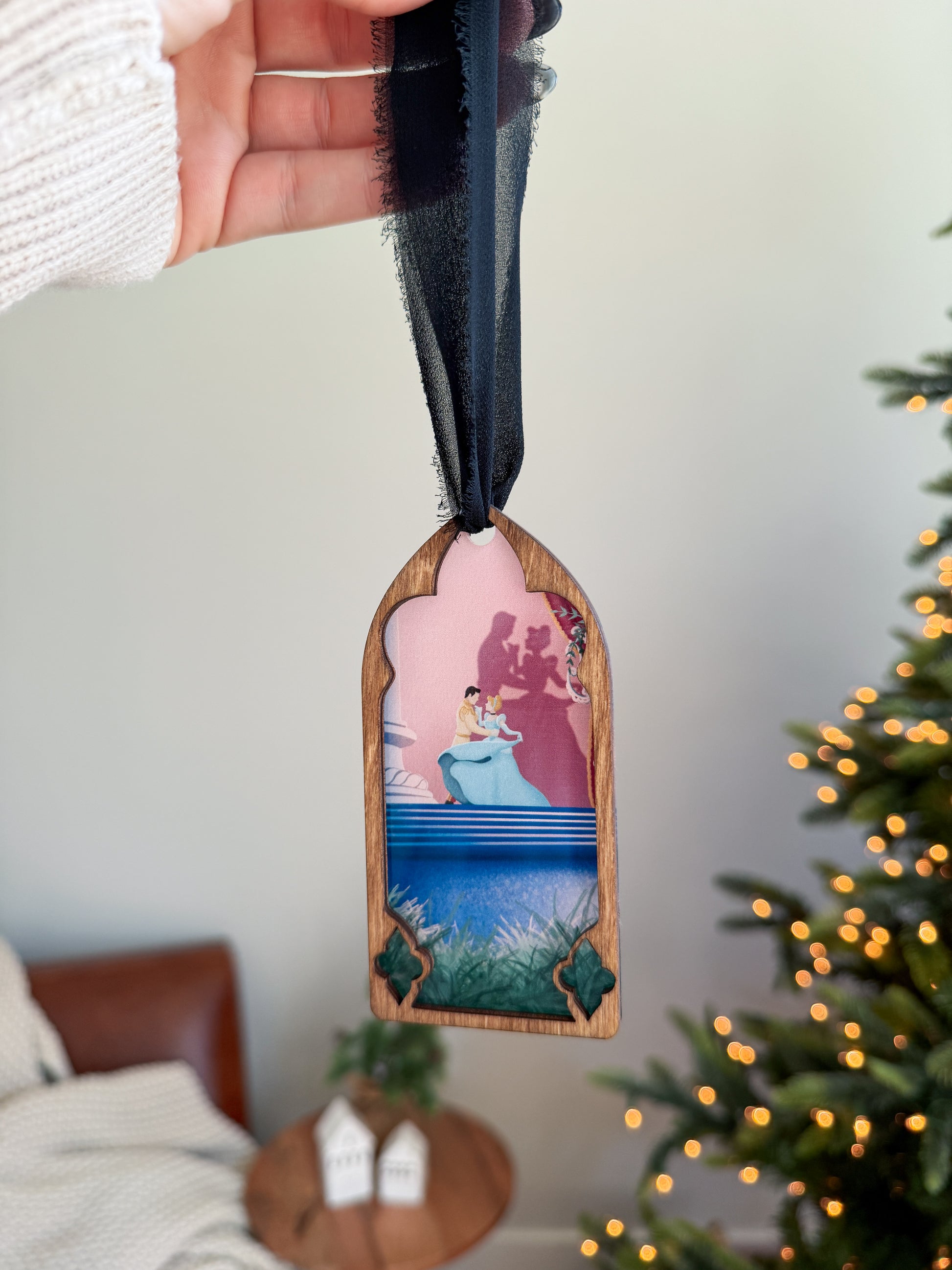4.5" printed acrylic ornament, featuring faux wooden frame and chiffon hanger.