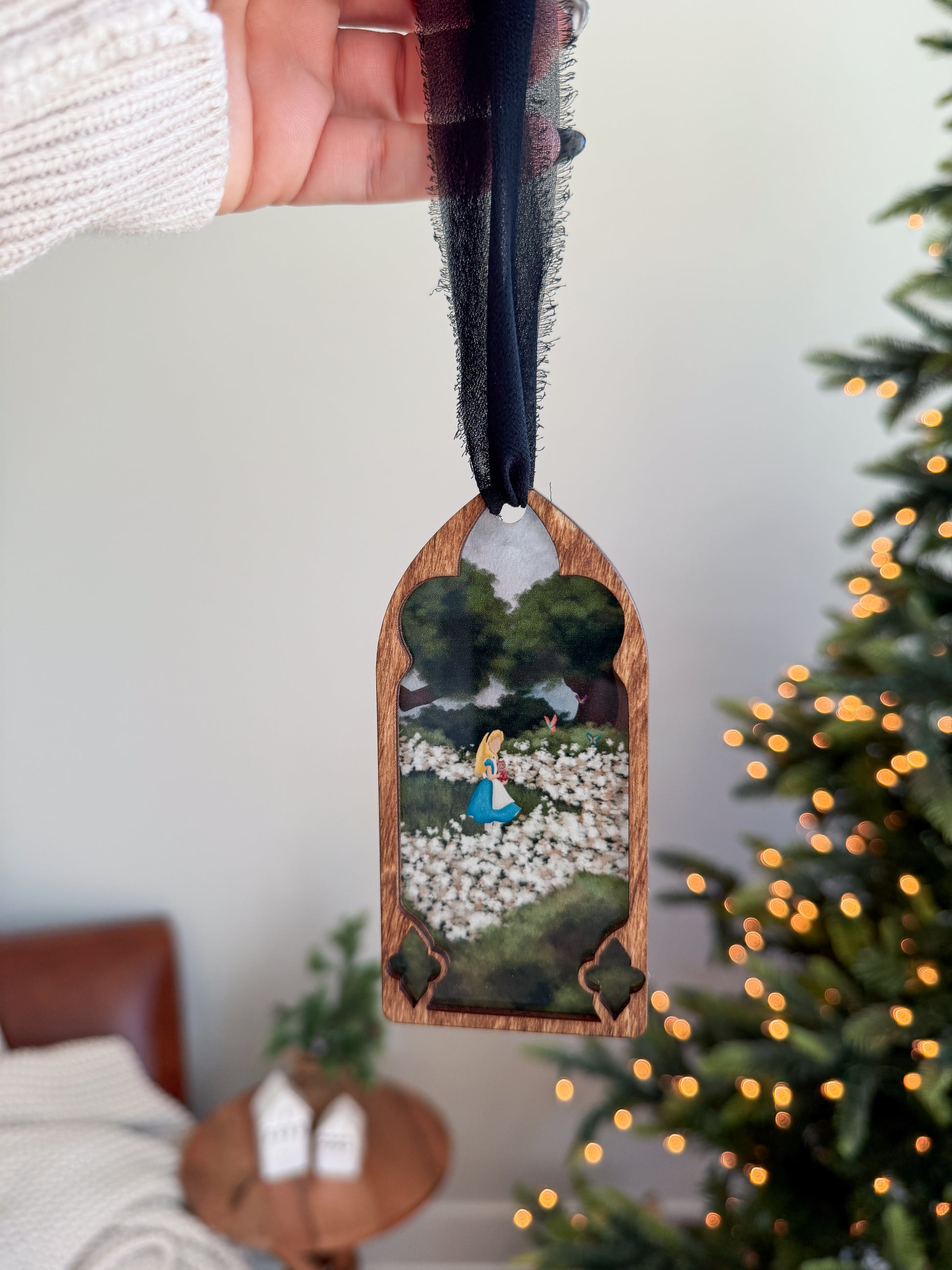 4.5" printed acrylic ornament, featuring faux wooden frame and chiffon hanger.