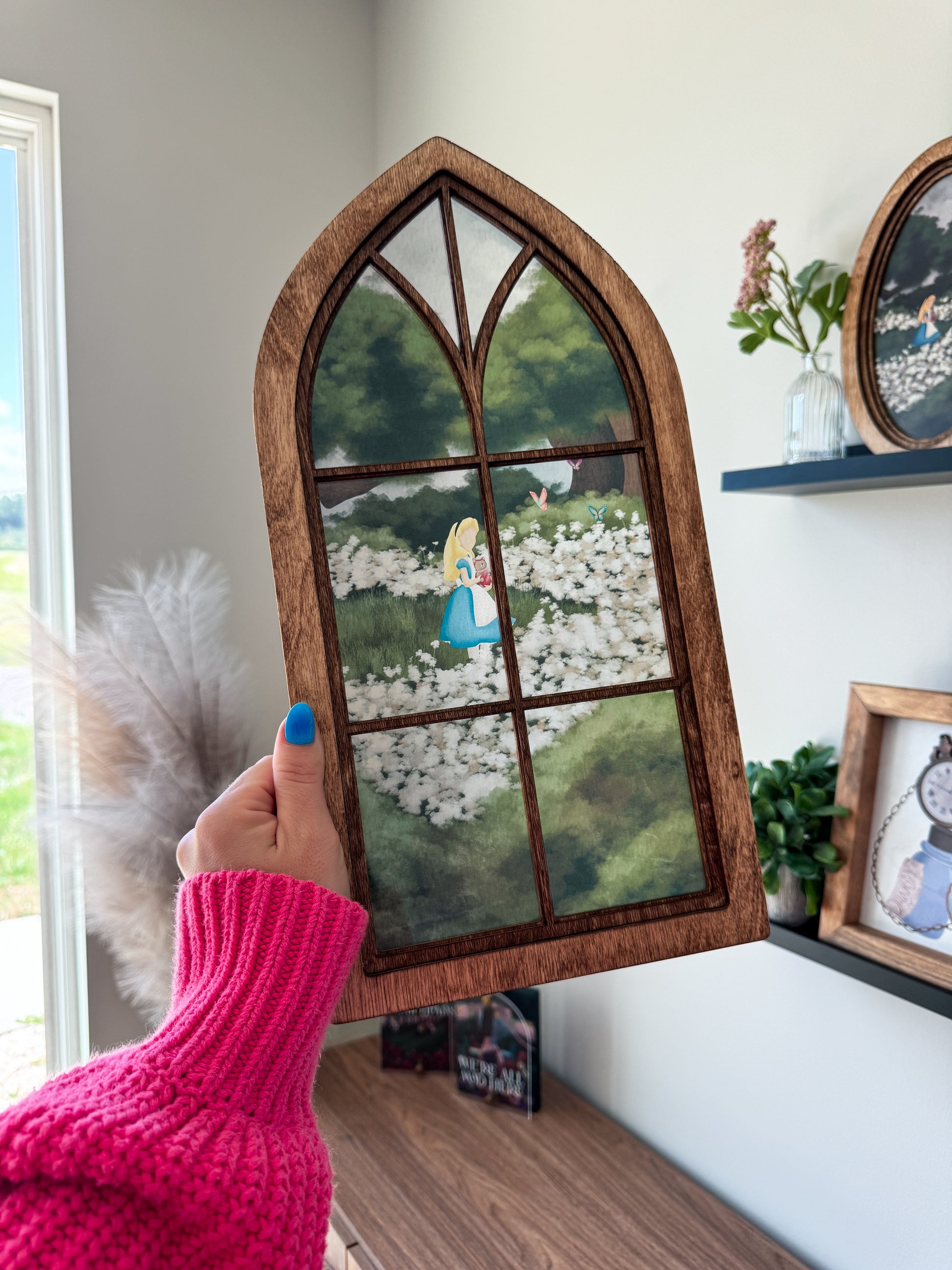 16x8" Cathedral Window inspired Sign. Featuring a faux stained glass look & a distressed faux multidimensional frame. Grain & Stain Pattern will vary. Hanging hardware not included.