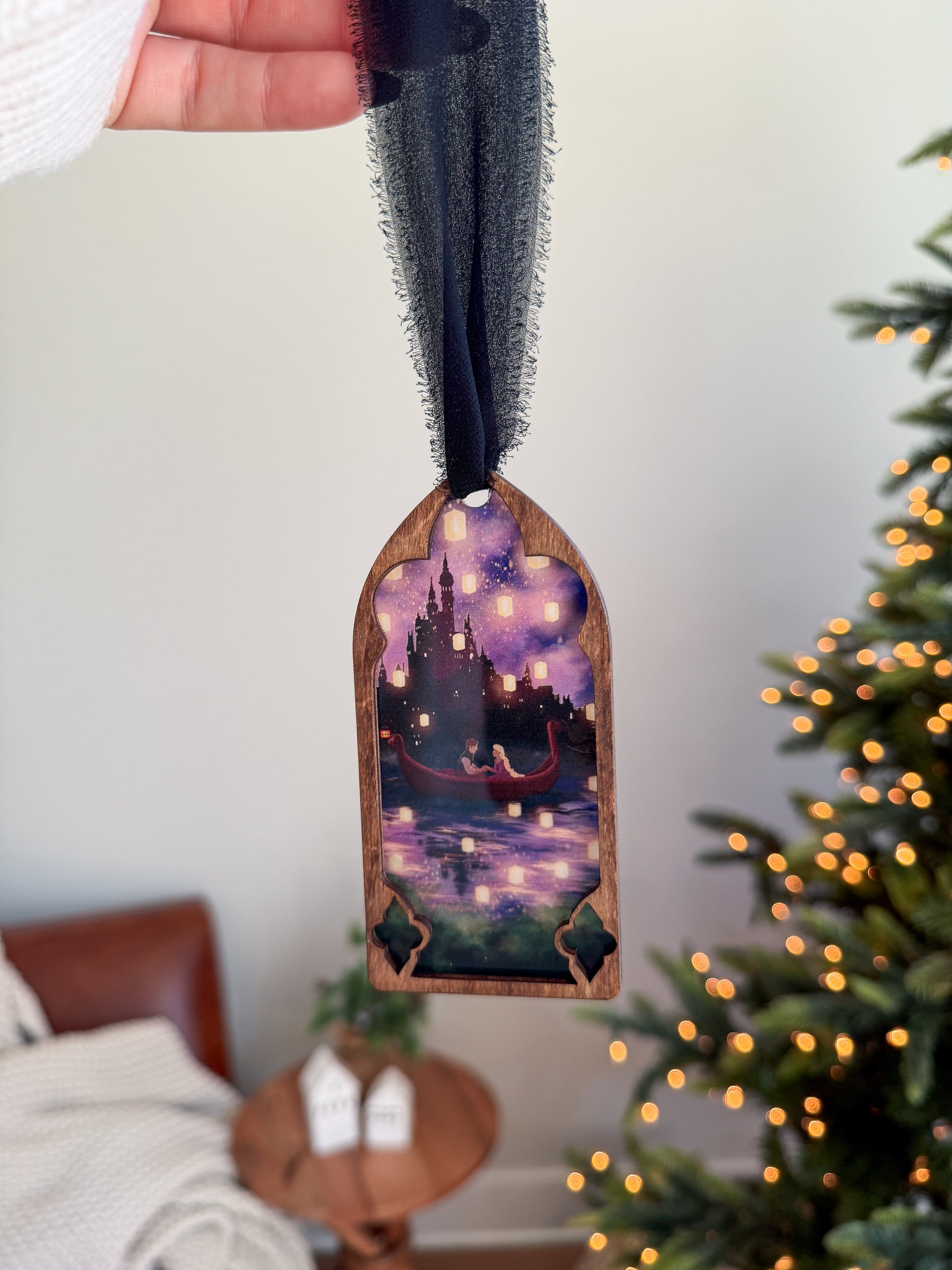 4.5" printed acrylic ornament, featuring faux wooden frame and chiffon hanger.