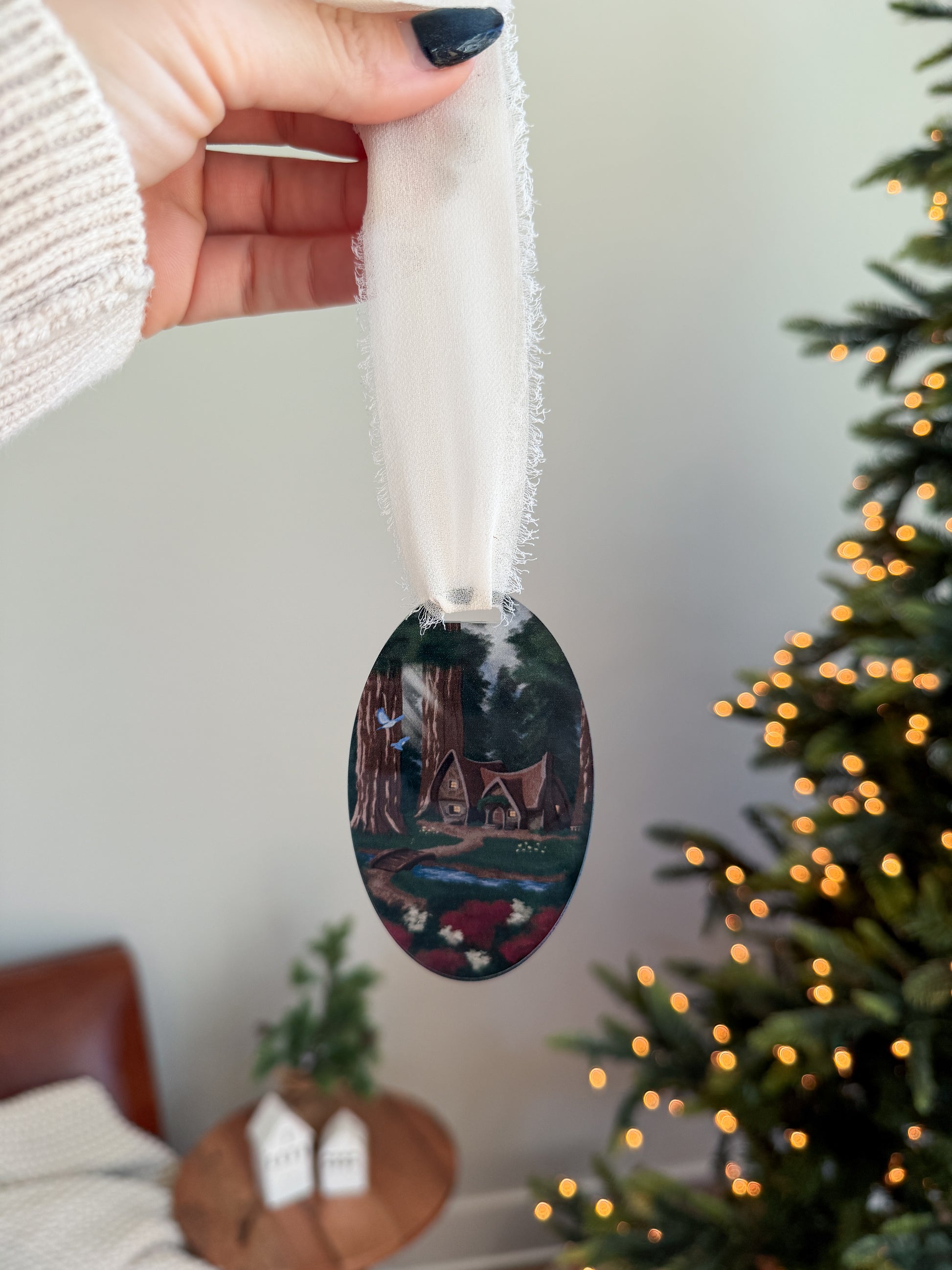 3" Luxe Printed Acrylic Ornament with Chiffon Ribbon.
