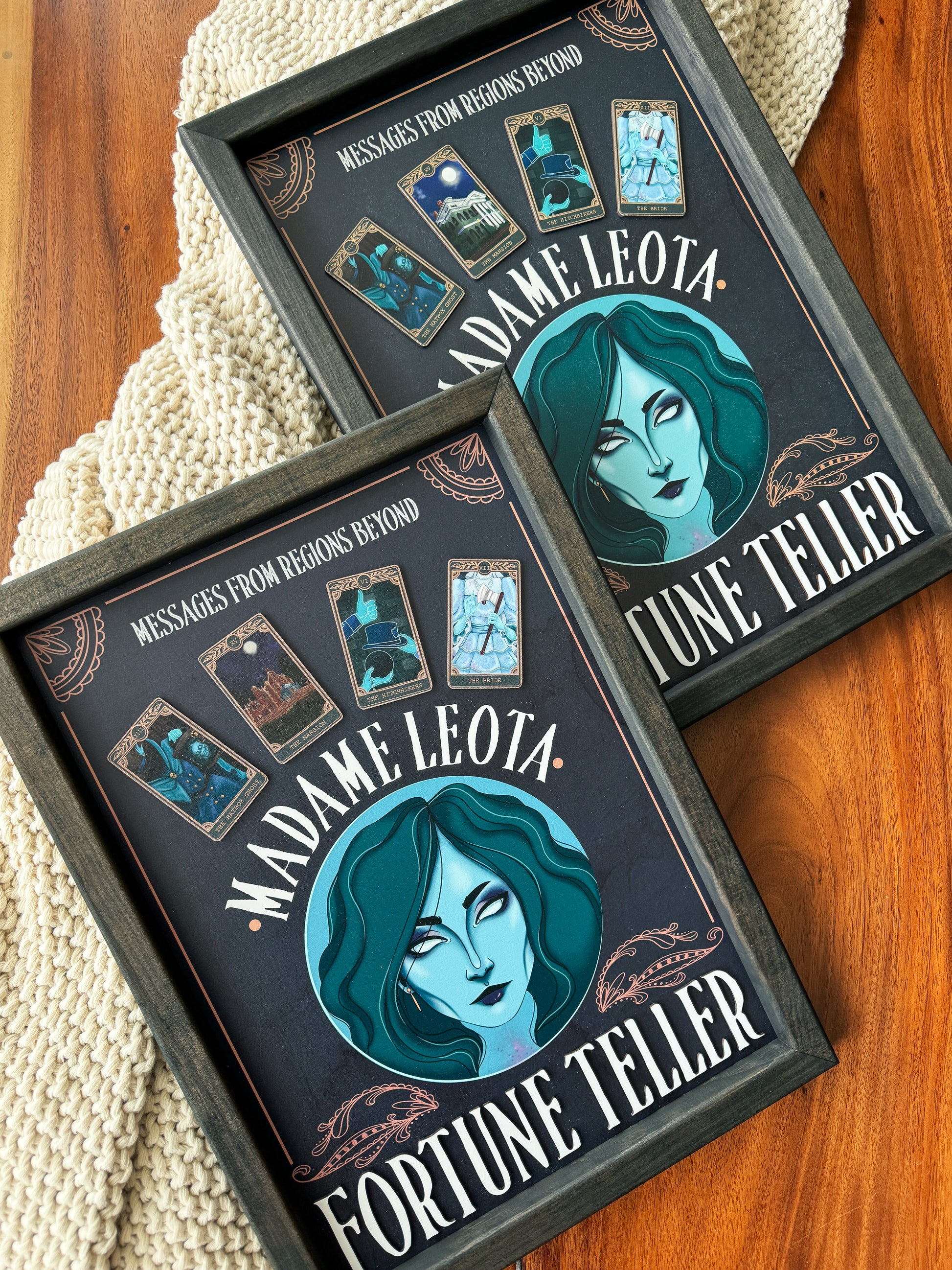 22x16" sign, featuring printed custom designed background, floating tarot cards & 3D lettering, and black stained frame. *Please note that variations in grain on frame will occur.