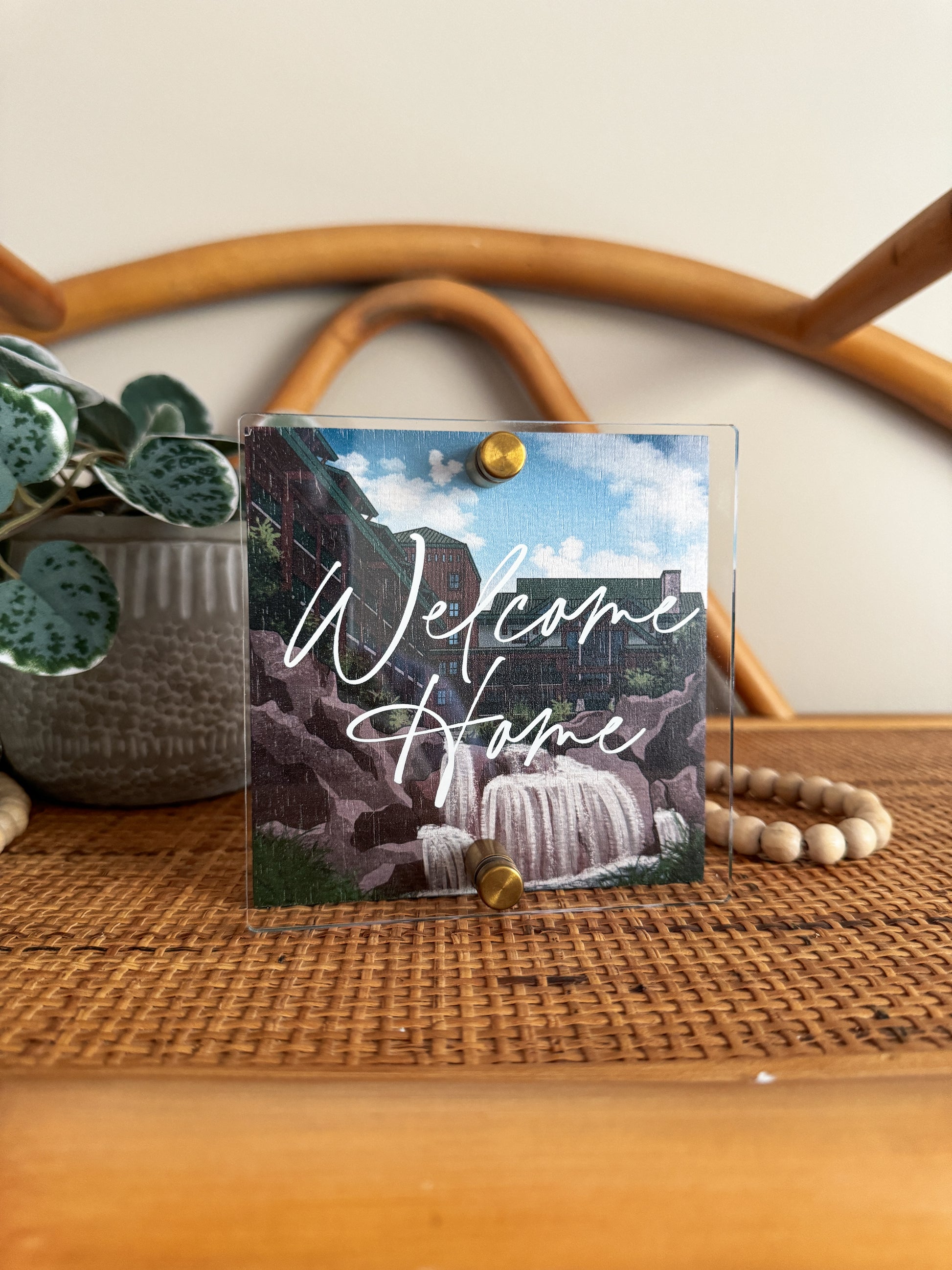 Custom Designed Block Sign featuring home resort printed on a natural block, "Welcome Home" Plaque & gold hardware. Measures 5x5" Grain/Stain pattern may vary.